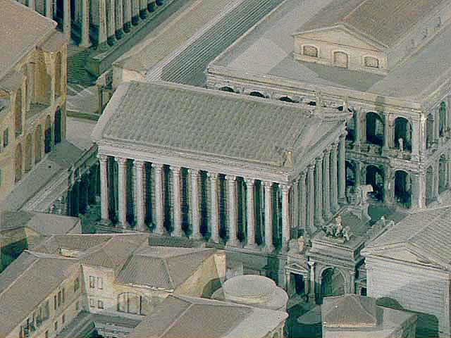 della Civiltà in Rome. Achter de tempel staat de Basilica Iulia, rechts ervan de boog van Augustus
