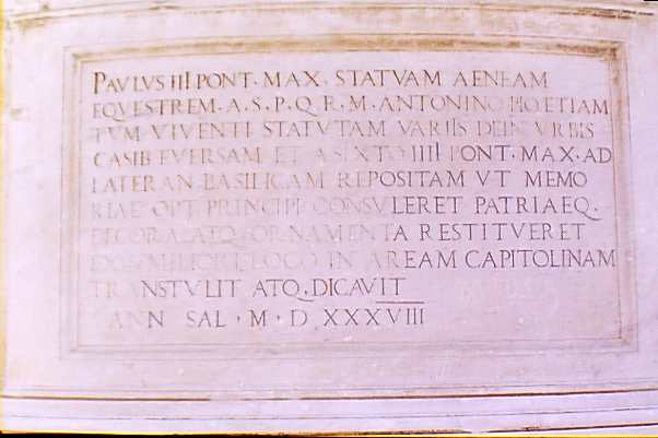 Vertaling: Paus Paulus III heeft dit bronzen ruiterstandbeeld, dat door senaat en volk van Rome opgericht is voor Marcus Antoninus Pius tijdens diens leven, dat vervolgens door de verschillende lotgevallen van de stad omver geworpen is en dat door paus Sixtus IV weer opgericht is bij de Sint Jan van Lateranen, overgebracht vanuit die te bescheiden plaats naar het plein van het Capitool overgebracht (om de herinnering aan die zeer goede keizer levendig te houden en om de sieraden en versierselen van het vaderland in ere te herstellen) en gewijd in het jaar des Heils 1538. Terug.