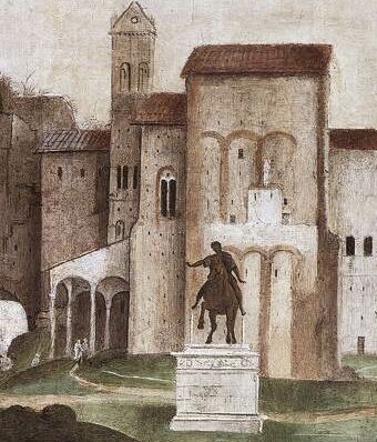 2. Paus Gregorius de Grote laat rond 600 het ruiterstandbeeld verplaatsen naar de Sint Jan van Lateranen. In 1538 wordt het beeld weer teruggeplaatst op het door Michelangelo nieuw ingerichte plein van het Capitool. Inscriptie op huidige basis.