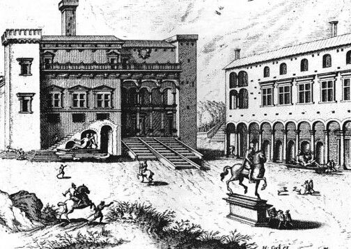 Onder twee bogen naast deze paarden liggen twee marmeren beelden1 van oude mannen, allebei veertig voet lang. Het verhaal wil dat het ene beeld Salomon is, het andere Vader Liber2. Het Bacchus-beeld houdt een wijnstok in de hand, Salomon een scepter.
