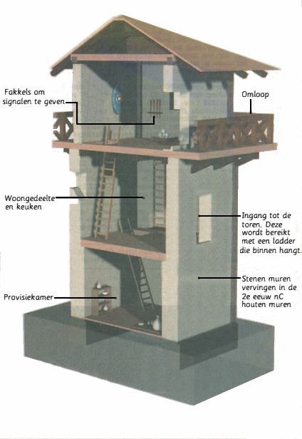 De hoekpalen van de oudste toren zijn gemaakt van lokaal zachthout, mogelijk van es of iep. De palen van de tweede toren zijn van eikenhout uit waarschijnlijk Duitsland. De torens, met een plattegrond van drie bij drie meter voor de oudste en 3,60 bij 3,60 meter voor de jongere, hadden een bemanning van naar schatting vier soldaten. De ingang zat op de eerste verdieping en was met een trap te bereiken. Daar was ook het woongedeelte en de keuken, waar de soldaten tijdens een wachtperiode van enkele dagen verbleven. Voor het eerst zijn bij een wachttoren vondsten gedaan die meer vertellen over het dagelijks leven op zo'n toren. Graafstal en zijn team hebben naast een fragment van een maalsteen, een slingerkogel, mantelspelden en aardewerk gevonden ook etensresten zoals visgraten. Twee triktrakstenen maken duidelijk dat er ook momenten van ontspanning waren tussen het wachtlopen op de zeven meter hoge bovenste verdieping.