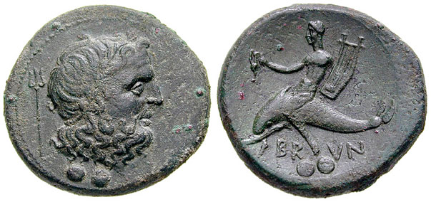 Achterzijde: Jongeman op dolfijn, terwijl hij in zijn linkerhand een cithara vasthoudt en in zijn rechter een cantharus. Onder de dolfijn staan BRVN en 2 balletjes