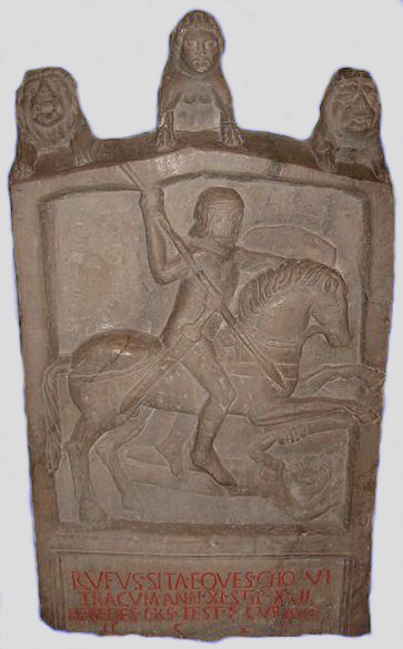 RVFVS SITA EQVES CHO VI TRACVM ANN XL STIP XXII HEREDES EXS TEST F CVRAVE H S EIn de 3e regel staat EXS: moet EX zijn.