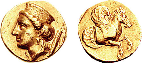 afgebeeld (Boven: een gouden stater met Hera links, rechts het gevleugelde paard.
