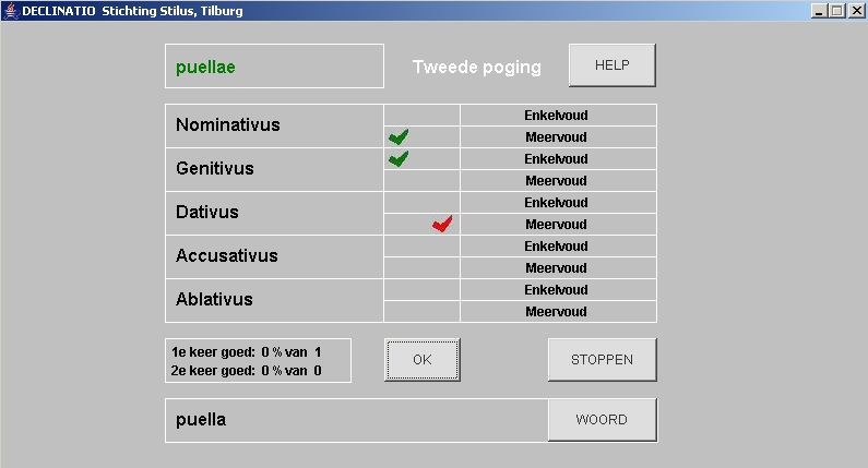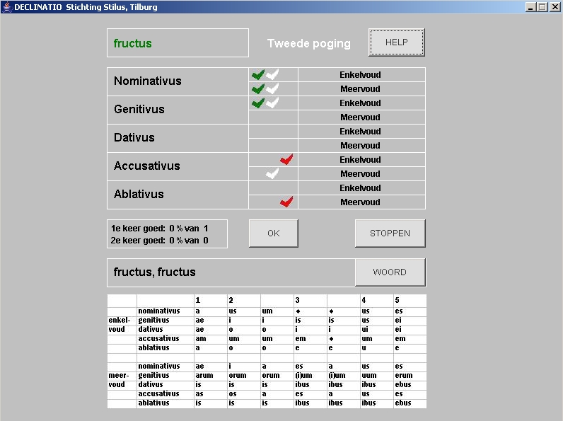 DECLINATIO laat de gebruiker oefenen met de naamvallen van het zelfstandig naamwoord.