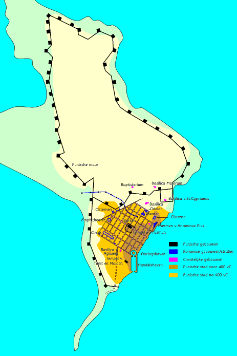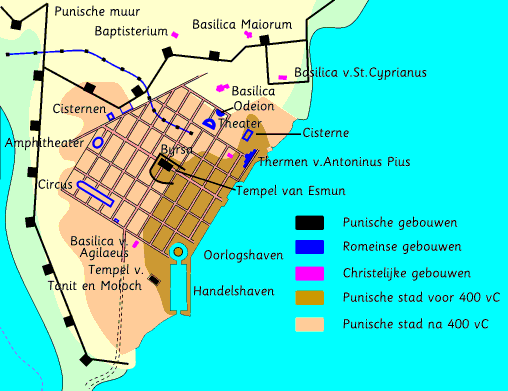 (V) Topografie. Op bijgaande kaartjes is de ligging aangegeven van de voornaamste punten en monumenten van het punische en van het romeinse Carthago. Beider stadsplannen hebben niets met elkaar gemeen dan de natuurlijke gesteldheid van het terrein. Het centrum van de punische stad, die in de 3e eeuw vC ca. 400.000 inwoners geteld moet hebben, strekte zich uit ten oosten en zuidoosten van de afzonderlijk ommuurde burchtheuvel Byrsa. De dubbele binnenhaven - het rechthoekige zuidelijke deel bestemd voor de handels-, het ronde noordelijke deel voor de oorlogsmarine - bood plaats aan honderden schepen. Op de Byrsa stond de tempel van de god Esmun, de tempels van Tanit en Baal Hammon moeten vermoedelijk gelocaliseerd worden resp. ten westen en ten noorden van de haven. De noordelijke buitenwijken heetten Magara of Megara; ook deze lagen binnen de 33 km lange stadsmuur. Van de gebouwen en omwalling van het punische Carthago is echter, op schaarse fragmenten na, zo goed als niets teruggevonden.