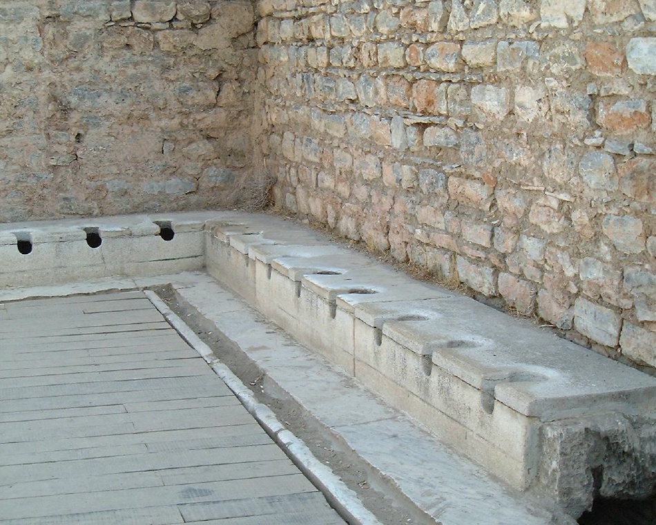 De zitplaatsen zijn langs drie zijden van een open peristylium