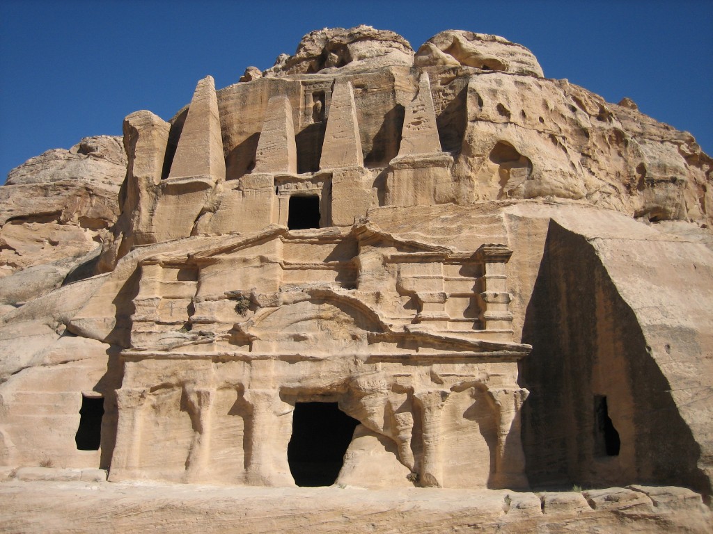 Het priramidengraf of obeliskengraf (bovenin) kent een klassieke ingang die leidt naar de kamer waarin zich vijf graven langs de muren zich bevinden, vier worden vertegenwoordigd door de piramidevormige zuilen, het vijfde door een standbeeld tussen de 2 middelste zuilen. Het is zoals alle graven in Petra, uit de rots gehakt, maar de stijl is uniek en komt waarschijnlijk uit Alexandrië, een belangrijk centrum van de verering van de god Dushara.