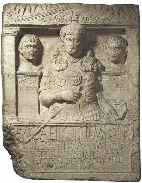 het Teutoburger Woud is gesneuveld. Hij draagt een corona civica.