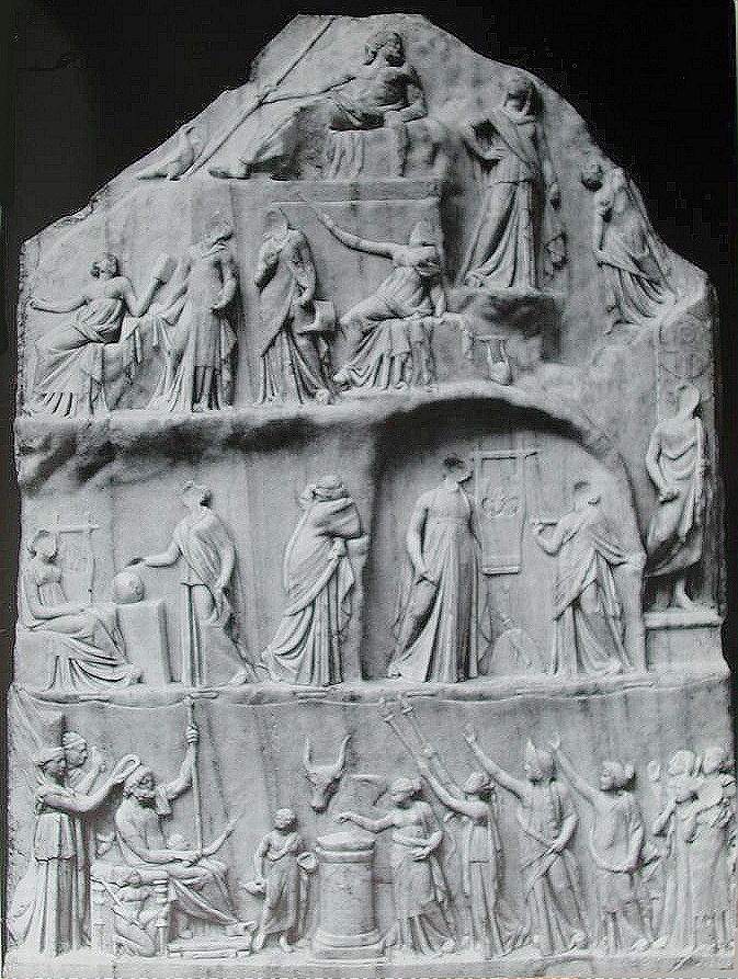 aangetroffen in Priene. De beneden links zetelende Homerus wordt gekroond door