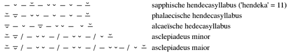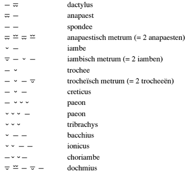 (1) Prosodie (leer van de kwantiteit der lettergrepen). Als lang gold een lettergreep niet alleen als ze een lange klinker of een tweeklank bevatte, maar ook als ze bestond uit een korte klinker gevolgd door twee of meer medeklinkers waarvan de eerste niet tot de volgende lettergreep werd gerekend; alle andere lettergrepen golden als kort en kregen bij de voordracht ongeveer de helft van de duur van een lange.
