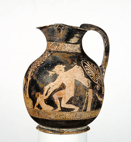 links pakt Hermes de kleine Arcas op (Chous uit ca.370 vC, P.Getty Museum, Malibu)