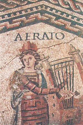 Erato (Ἐρατώ), muze van de lyrische poëzie en het fluitspel. Zie Muzen. Hiernaast een mozaïek uit Vichten in Luxemburg.