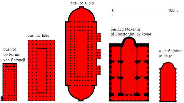 3. De z.g. Aula Palatina (56 x 27,5 m) in Augusta Treverorum (Trier), een uit één grote ruimte bestaande ontvangsthal die deel uitmaakte van het paleis dat keizer Constantijn in het begin van de 4e eeuw liet bouwen; deze basilica is geheel in de oorspronkelijke staat hersteld en doet thans dienst als evangelische kerk.
